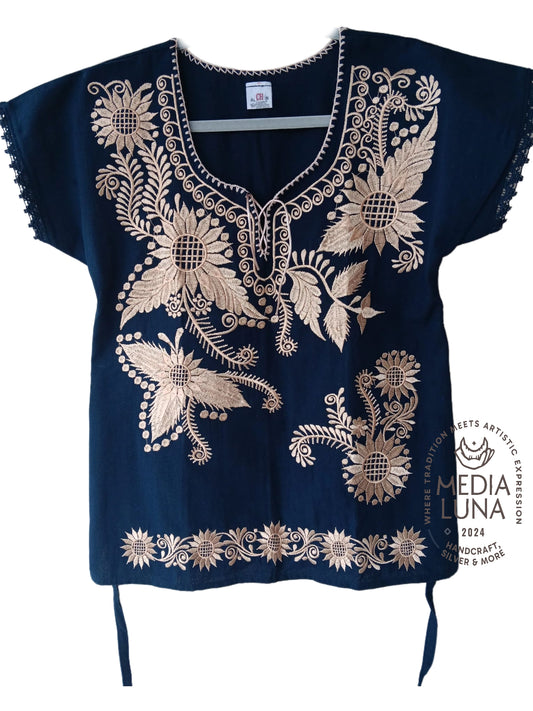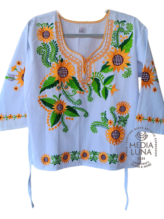 Blusa artesanal color azul turquesa con bordado de girasoles.