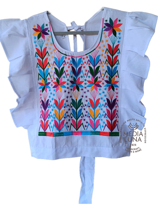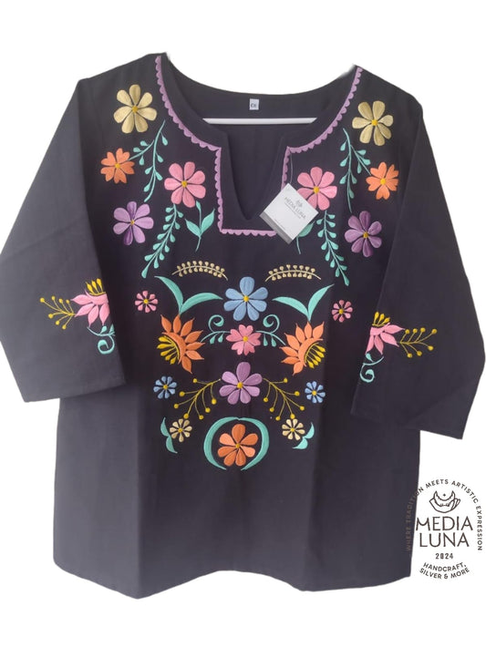 Blusa artesanal de algodón bordada con motivos florales y de Fiestas Patrias.