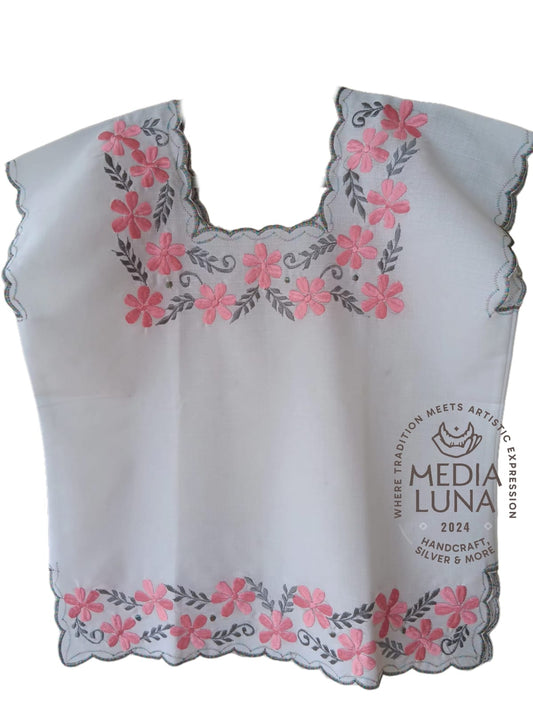 Blusa o huipil artesanal oaxaqueño de manta de algodón bordado a mano.