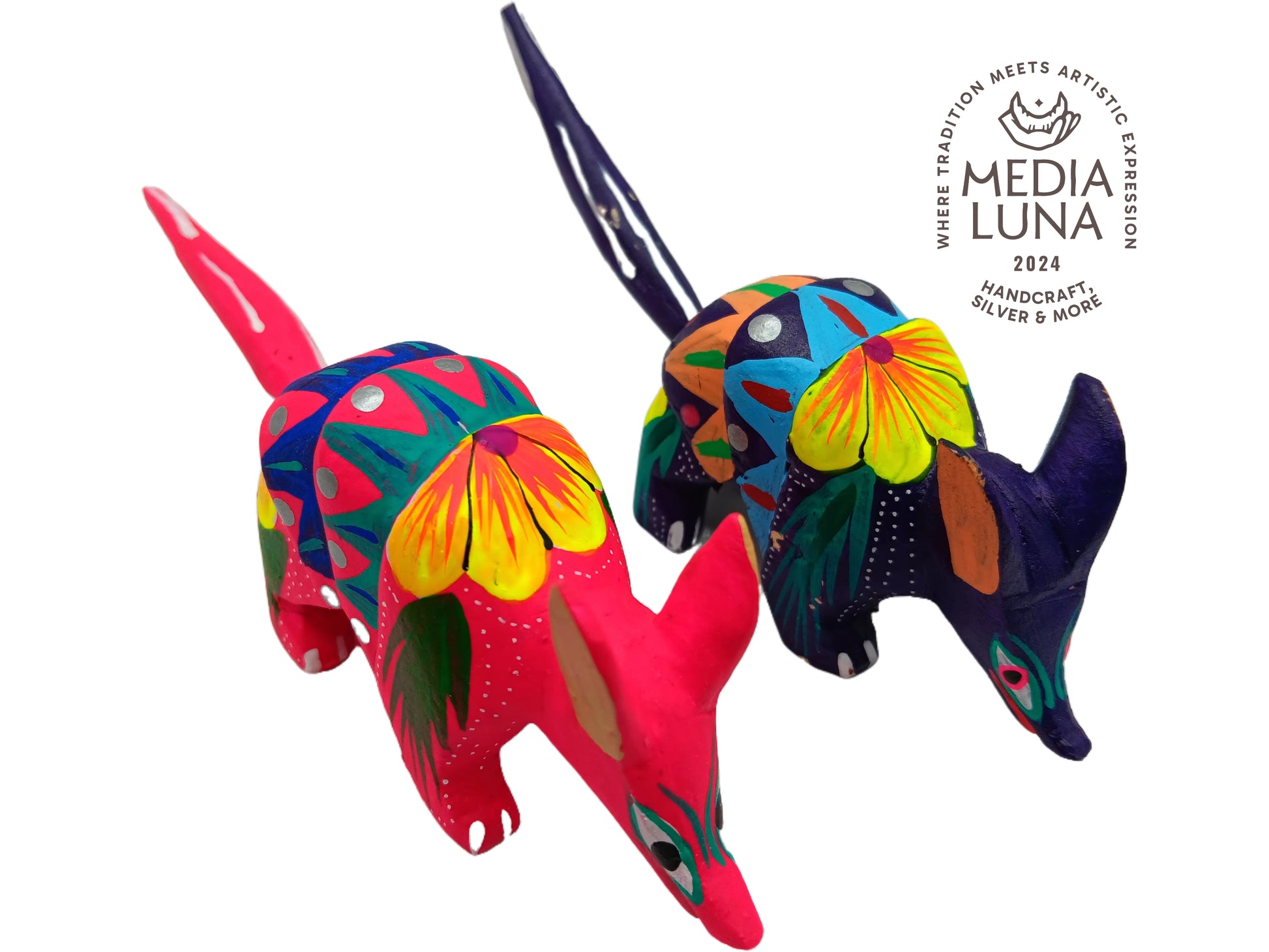 Este set de 2 hermosos Armadillos Alebrijes presenta figuras florales con vibrantes colores rosa, azul, amarillo y pinceladas en verde, con medidas de 2" alto, 1.5" largo y 5.5.