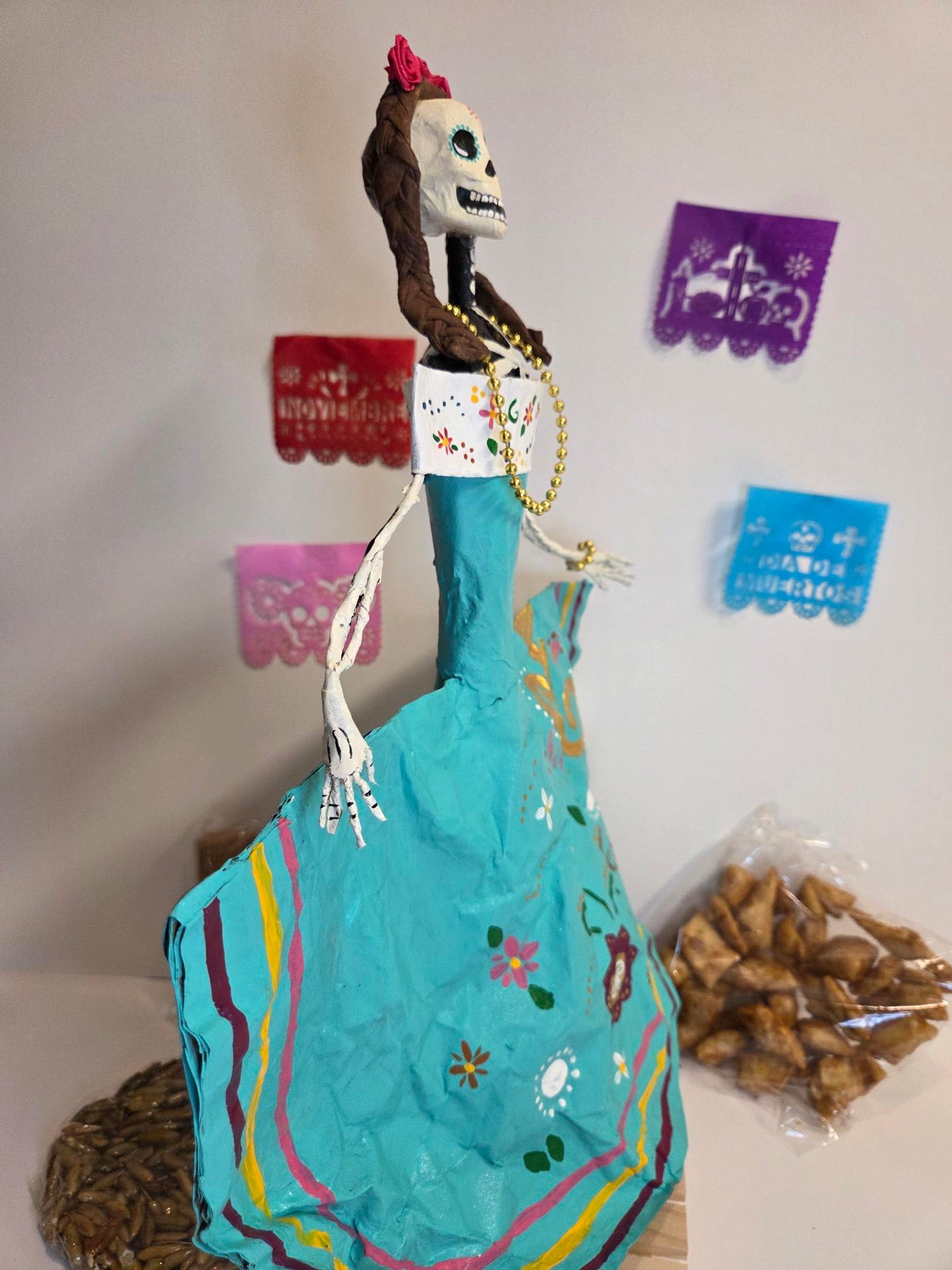 Esta hermosa Catrina lleva su nombre por el color dominante y vibrante de su falda. Elaborada totalmente a mano con papel maché con una altura de 17 pulgadas, refleja su naturaleza artesanal en la textura y el detallado pintado a mano.