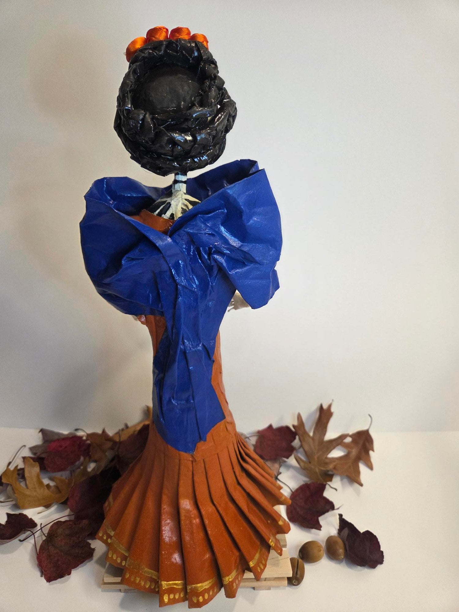 Esta preciosa figura artesanal de papel maché hecha y pintada a mano, lleva una falda (enagua) larga con un vuelo plisado en un profundo color naranja quemado o terracota, que recuerda al color de la flor de cempasúchil o las hojas de otoño. La falda está decorada con bordados o diseños de flores en color dorado.