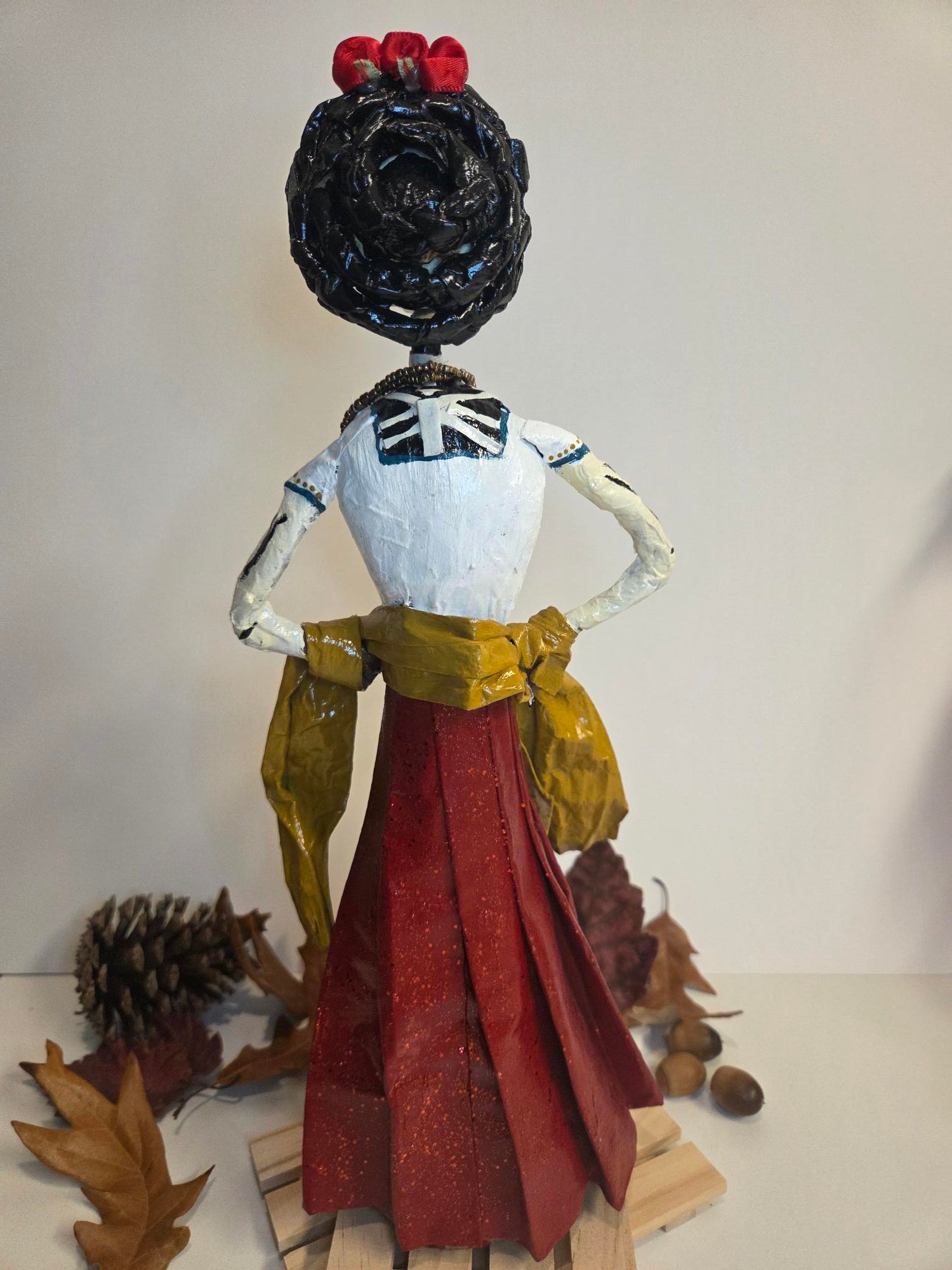 La Catrina Xóchitl tiene una figura con una postura elegante y enérgica, con las manos firmemente colocadas en la cadera lo que le da un aire de confianza y autoridad.