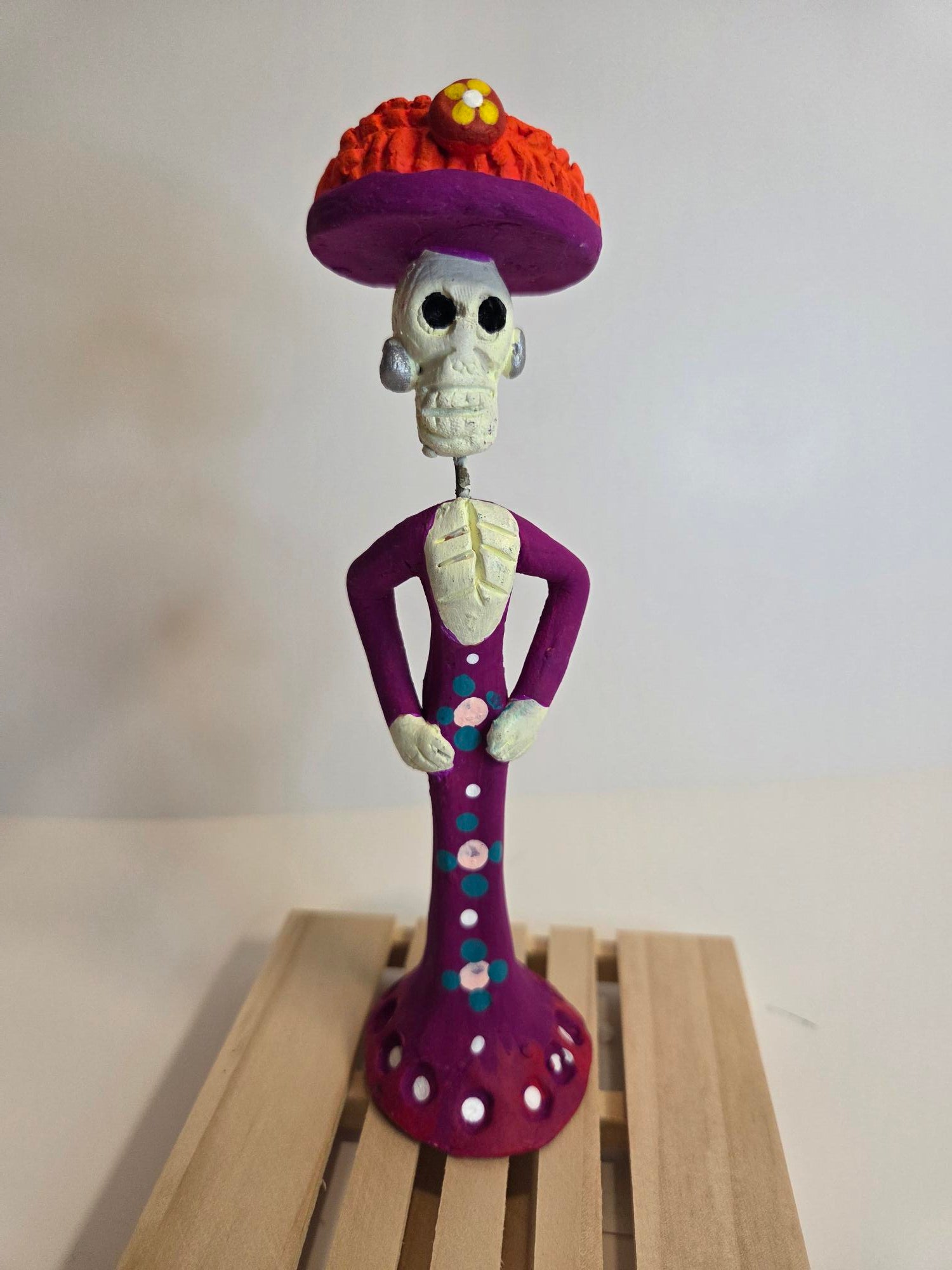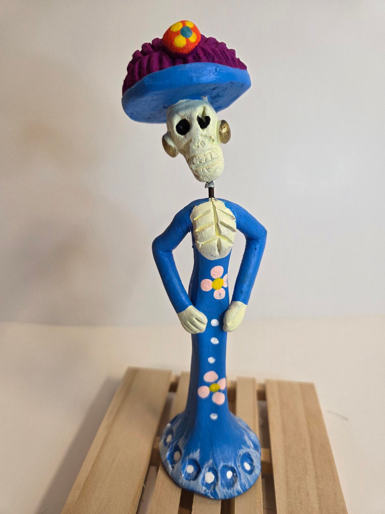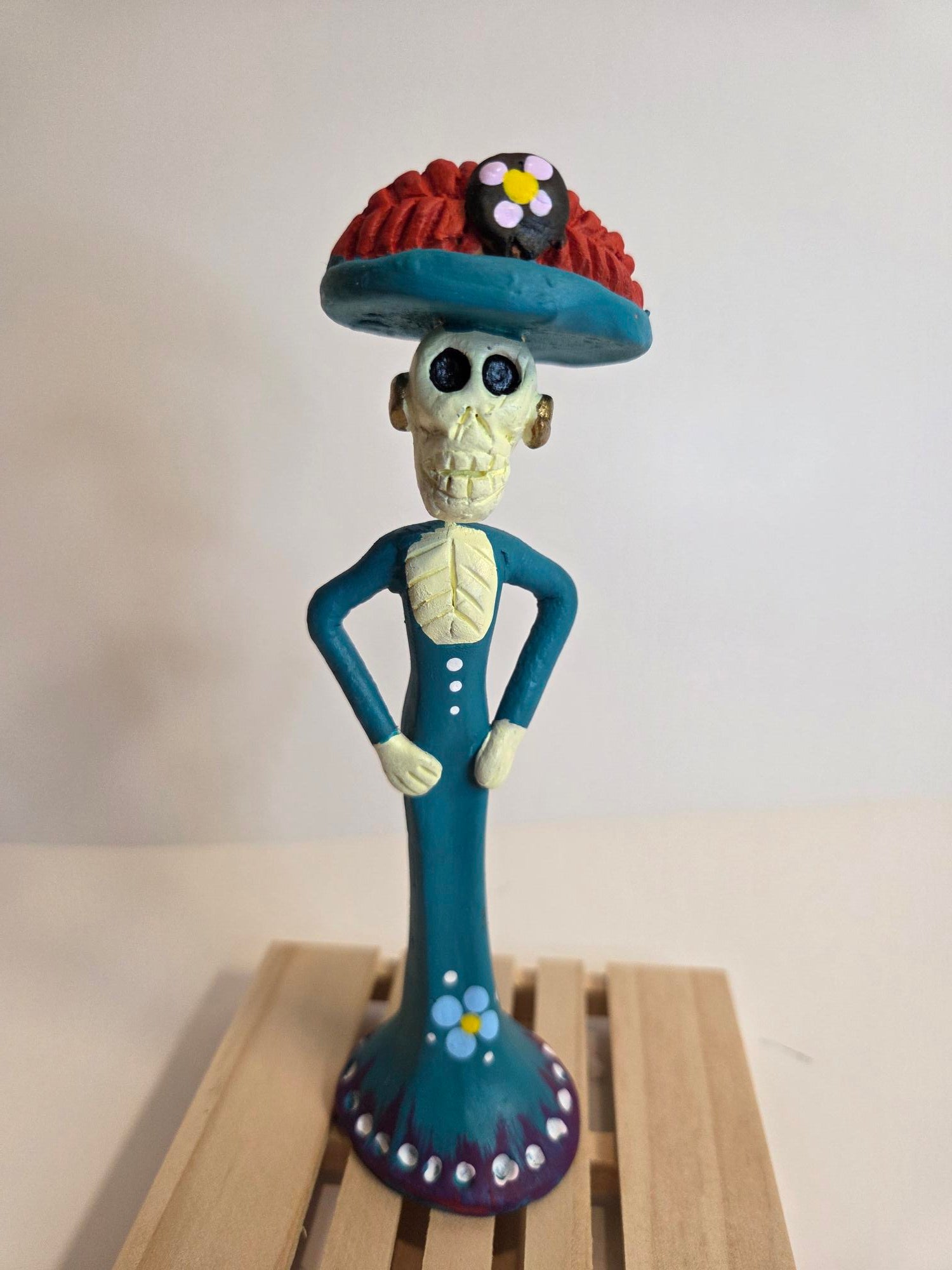 Todas nuestras Catrinas son elaboradas y decoradas a mano, lo que hace que cada pieza sea única y pueden presentar ligeras variaciones. Estas piezas tienen medidas de 6" de alto y 1.5" ancho, .