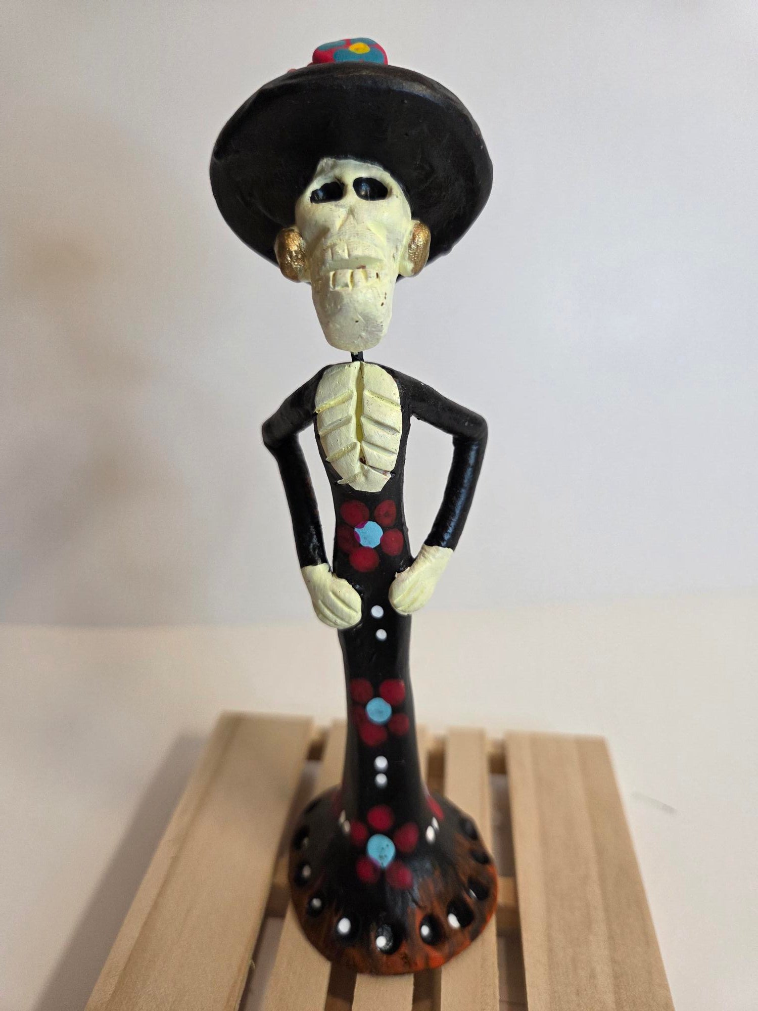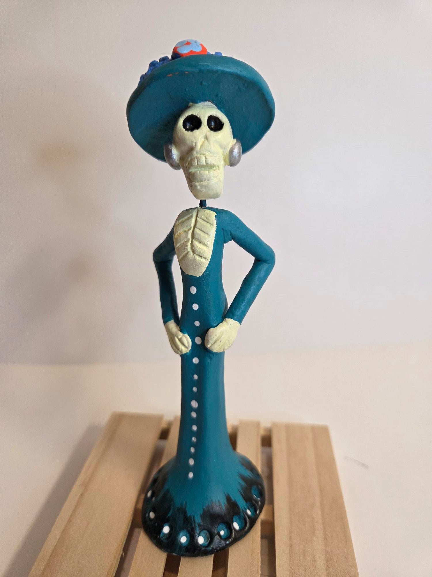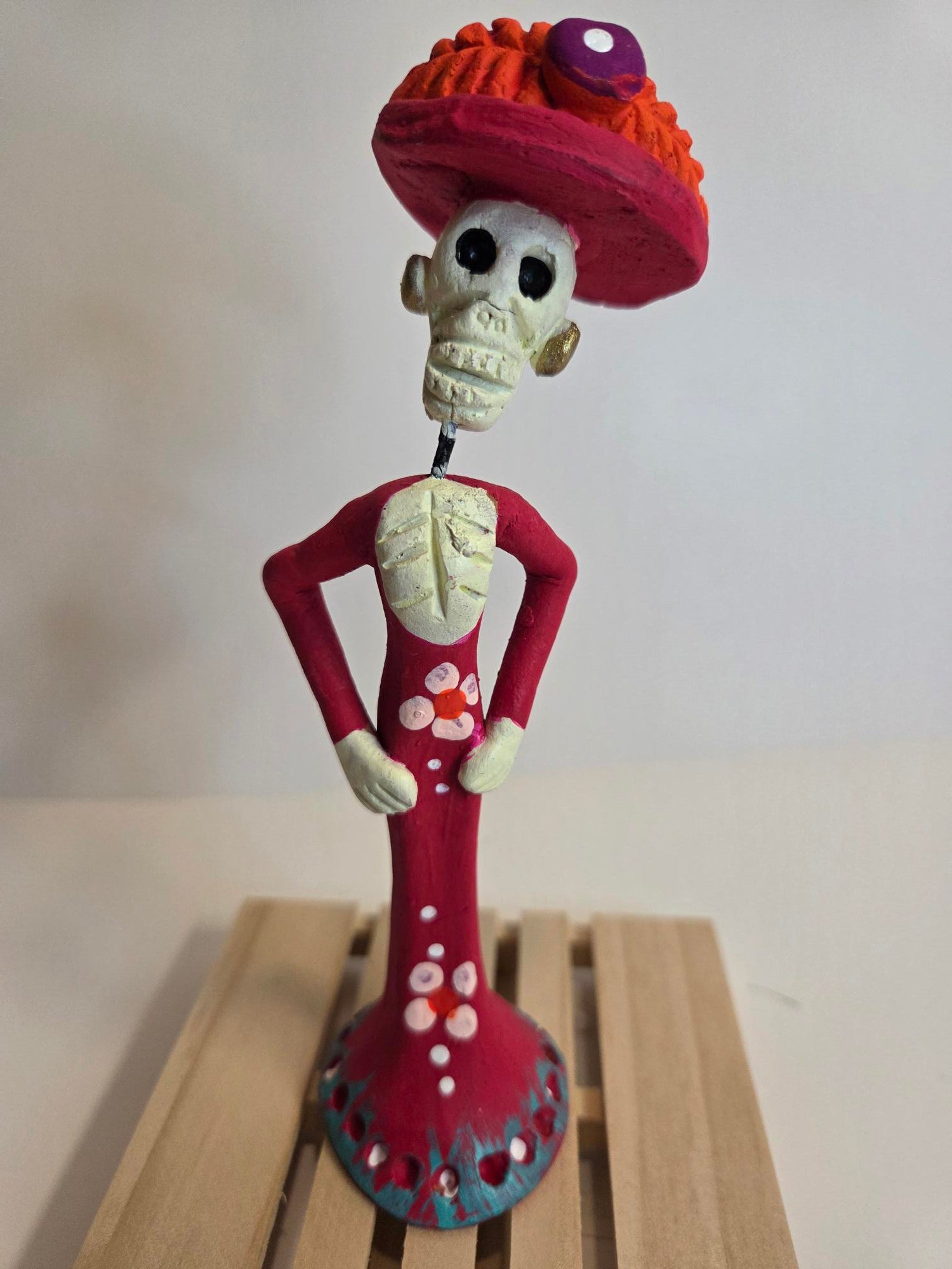 Todas nuestras Catrinas son elaboradas y decoradas a mano, lo que hace que cada pieza sea única y pueden presentar ligeras variaciones. Estas piezas tienen medidas de 6" de alto y 1.5" ancho, .
