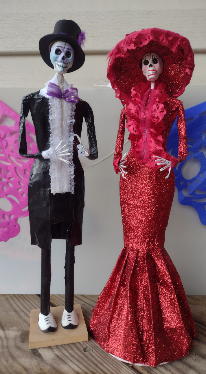 Conjunto de dos piezas bellamente elaboradas de papel maché, -conocidas comúnmente como "Catrines" (Catrina y Catrín)-, son las figuras más representativas del folclore mexicano asociadas con el Día de Muertos.