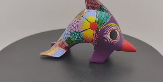 Este alebrije delfín es una pieza de arte popular vibrante y llena de detalles que reflejan la creatividad y el espíritu imaginativo del artesano que lo creo.