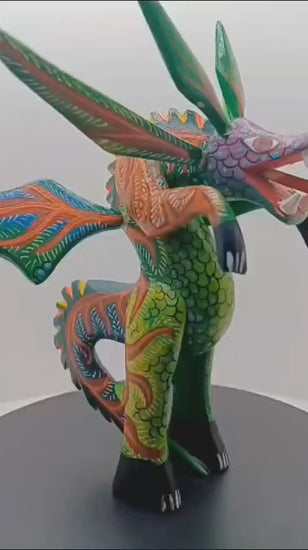 Este maravilloso alebrije dragón es una pieza de artesanía mexicana tallada en madera de copal, que combina la figura mítica del dragón con la estética colorida y fantástica característica de los alebrijes de Oaxaca.
