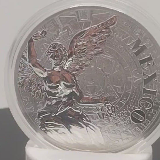 Medalla de Plata Ley .999 acuñada por la Casa de Moneda de México con un acabado Mate brillo, con el fin de representar los iconos de la mexicanidad: en el Anverso la Pirámide del Sol, el Palacio de Bellas Artes, el Monumento a la Revolución, los volcanes Popocatépetl e Iztaccíhuatl y el Águila Real devorando a una serpiente de Cascabel.