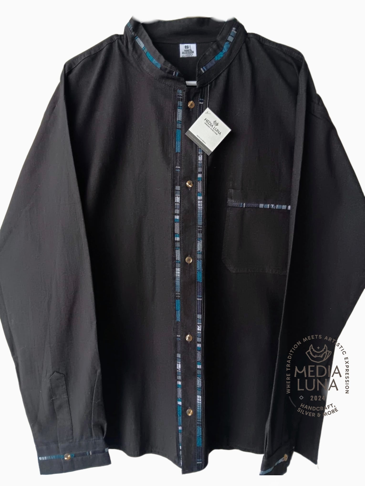 Esta elegante camisa tipo guayabera de algodón combina la frescura de su tejido con detalles artesanales vibrantes. La pieza central del diseño es la franja vertical que recorre el frente, adornada con un patrón geométrico rico en colores, evocando la tradición textil.
