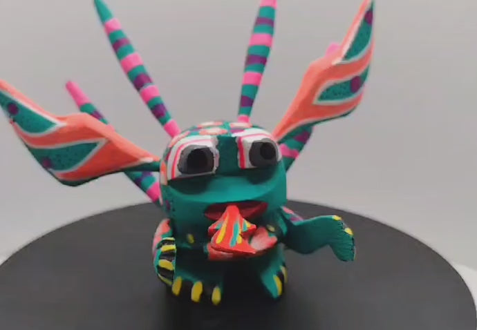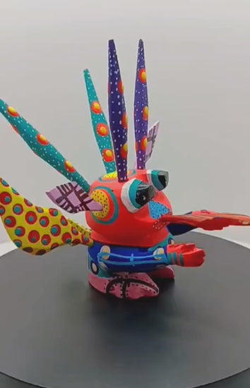 Estas piezas combinan elementos de diferentes animales, lo que les da un aspecto único y fantástico. Están pintados con una paleta de colores intensos y contrastantes como el turquesa, rosa, naranja, amarillo, azul y verde.