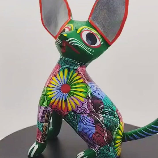 Lo más llamativo de este alebrije Xoloitzcuintle es su increíble colorido y la profusión de detalles pintados a mano. Se aprecian una gran variedad de colores brillantes como el verde intenso que cubre gran parte del cuerpo, contrastando con zonas en rosa, morado, amarillo y azul.